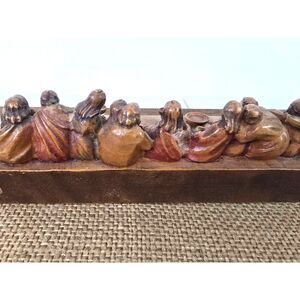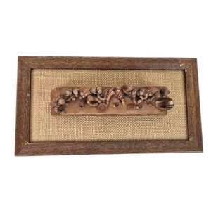 Molded composite resin, hand painted in earthy tones. Most likely from the 1960s-70s. Burlap and molded resin were very popular in religious wall are from that time.