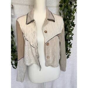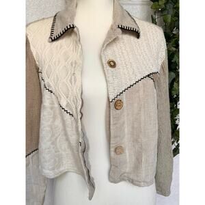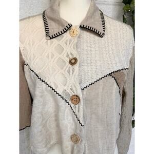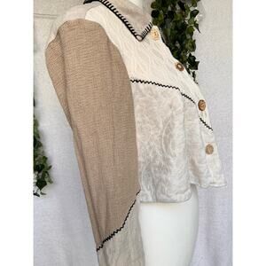 Vintage The Limited Patch Work Cropped Button Up Top. Shirt is in great condition with no flaws, rips or stains. Shirt is multiple shades of beige in color with black stitching. Shirt is cropped length and is a size Medium. Shirt is made up of Linen, Silk, Cotton, Rayon and Polyester. The tag is faded in some spots so it is hard to see the amount of each material. Top has unique wooden buttons all with a different look.