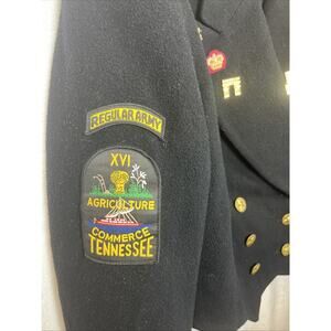 It has a Tennessee agriculture, commerce regular army patches on the side . It also has several pins on it that can be removed. The only thing on the lapel that cannot be removed are two red patches with crowns.