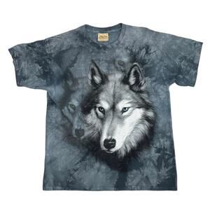Keywords: The Mountain 2002 Wolf Head Tee, Vintage, Tee Shirt, Short Sleeve, Large, Retro, Animal Face, Summer, Spring, Fall, Autum, Trendy, Blue, Tie Dye, Crew Neck, Old School, Dark, Unisex, Men, Women,