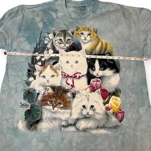 Printed on a soft blue tie-dye cotton base, the front showcases a group of seven playful kittens among flowers — a true Y2K nostalgic piece. There is a small mark on the back that is pictured.