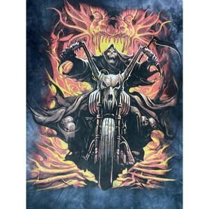 Vintage The Mountain graphic tee in charcoal. Tagged Men’s Size 2XL. Bold skeleton-on-motorcycle design with biker aesthetic and classic cotton blend. Great for vintage drops, biker bundles, or The Mountain listings.