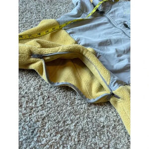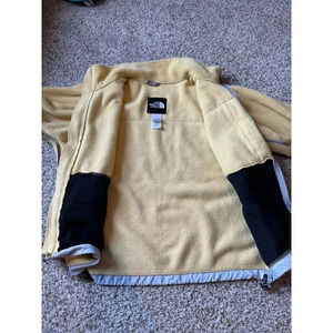 Vintage The North Face Denali Fleece jacket, in very good condition. Butter Yellow with Gray accents. Pit zips to help you cool off, Several zippered pockets, drawstring at bottom,