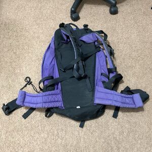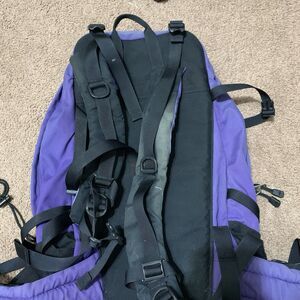 This North Face hiking backpack appears to be vintage. It features only one main compartment with one small zipping pocket inside. There are no front or side pockets. It has a hard shell back and waist support bands with large buckles. There is some sun bleaching on the nylon fabric.