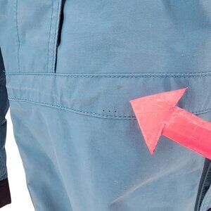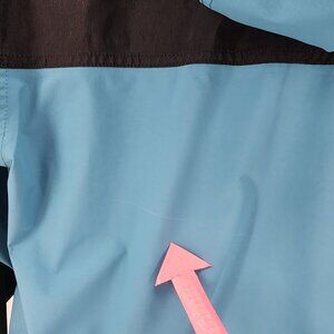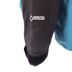 Long sleeve hooded zipper jacket with a blue & black color block design. Full zipper down the front with snap buttons. Elastic drawstring hood. 2 front zipper pockets. Inner black logo lining with one inner zipper. Gore-Tex fabric. Outdoors, hiking, skiing, snowboarding