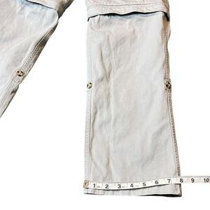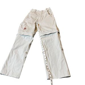 3 way Convertible cargo pant. Wear them long, roll them up to capris or turn them into shorts! Two front pockets, one side pocket and one back pocket button/ zip closure side leg 100% cotton.