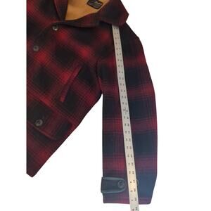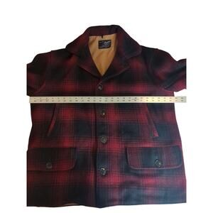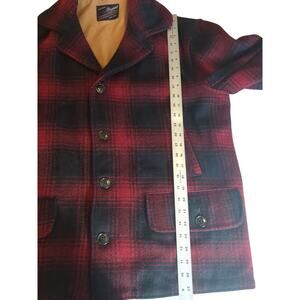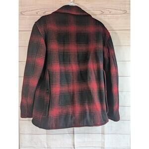 This vintage hunting coat from The Original Drybak in Binghamton, NY features a classic red and black plaid design, typical of traditional hunting attire. Made from wool, this long sleeve coat has a regular fit with a chest size of 25" armpit to armpit and a shoulder to hem length of 27". The United States-made coat exudes a timeless hunting coat look, perfect for outdoor enthusiasts looking for a rugged and stylish piece of outerwear.
