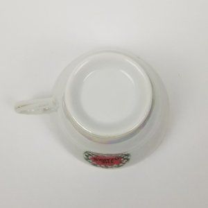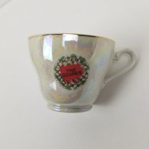 Vintage The Ozarks Souvenir Tea Cup & Saucer, Pearlescent, opalescent white lusterware with gold trim.