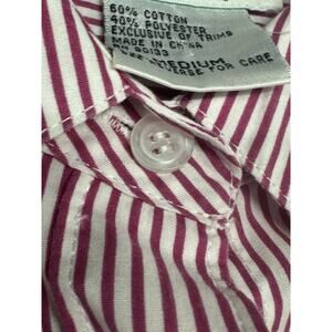 The Vintage Quacker Factory M Red White Stripe Dragonflies Short Sleeve Shirt is a charming and versatile top perfect for casual occasions. Made from breathable cotton knit fabric, this shirt features a collared neckline with a button closure and embroidered dragonflies and glitter accents for added flair. The classic red and white striped pattern and regular fit make it suitable for wearing in the summer, fall, or spring seasons. With a vintage appeal and nature-inspired theme, this shirt is a lovely addition to any woman's wardrobe.