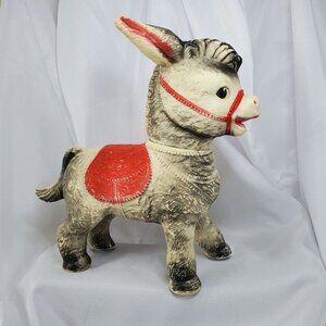 This 1961 Sun Rubber Co. donkey figurine showcases exquisite craftsmanship with a charming design. Measuring 11 inches, it is an ideal piece for collectors.