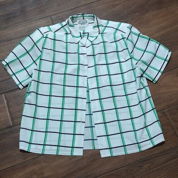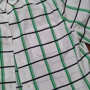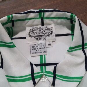 Vintage The Villager size 10 light weight short sleeve button down shirt. White with green plaid lines. Excellent condition. Has shoulder pads