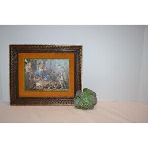 Vintage litho print in VERY good condition. Extremely well preserved and clean. Check out tiny marks Originally created around 1665, Spanish Baroque art. Set in green then golden brown velvet and beautiful gold and brown frame. With glare off lens, you can see minimal marking.