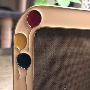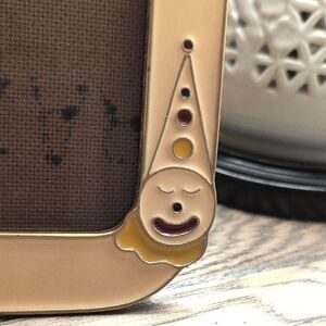 Vintage The Bucklers Inc Heavy Enamel Clown & Balloons Brass Picture Frame. This MCM Frame features a beige enamel background trimmed in gold, 1 smiling clown with a tall hat, 1 red, 1 yellow, and 1 blue balloon, and a swivel easel back which adjusts for horizontal or vertical photos.