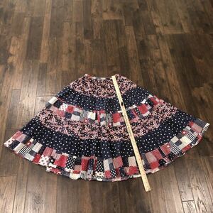 Vintage The Goldiggers 70s Floral Midi Skirt Hippie Boho Gypsy Peasant Patriotic. No noticeable flaws or stains. Measurements are in photos. There was no size tag, so please check measurements carefully. The waist is elastic, so it does have some stretch. Let me know if you have any questions!
