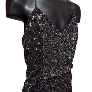 Stunning vintage 1970's-1980's black sequin gown by Themes ILGWU, sized XS (0-2). This elegant long sheath dress features a V-neckline, spaghetti straps, and a zip closure. The peplum top adds a classic designer touch, crafted from nylon, spandex, and sequins with a comfortable lining.