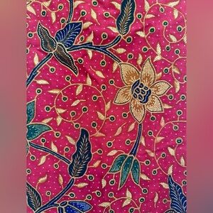 Talk about a showstopper. This vintage vest by Theo features a rich batik-inspired floral print on vibrant red cotton, complete with sequin embellishments for a subtle shimmer. Made in Indonesia and crafted from 100% cotton, this piece brings global texture and retro flair to any outfit.