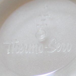 Very cool kitschy and retro coffee mugs made of a melamine-type material on the inside with a clear plastic covering over the outside of the mug. The design is under this plastic covering. Marked Made in USA Thermo-Serv. There are three different patterns, two are a very cool mushroom design, two are flowers and butterflies in yellows, greens, and reds, and the last is a single blue with strawberry blossom and strawberry. Measure four inches tall and hold a standard cup of coffee or tea. No yellowing or issues.