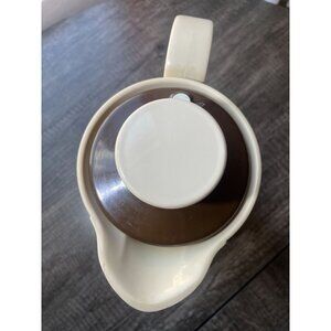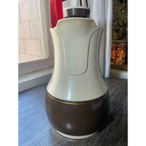The Vintage Thermos 570 Coffee Carafe Pitcher from Ingried, West Germany, offers timeless MCM style and superior insulation in brown and cream. Ideal for diners or home use.