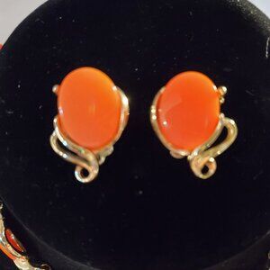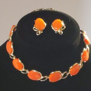 Vintage Thermoset Lucite Choker Necklace Earrings Set Orange Oval Gold Tone