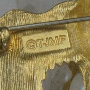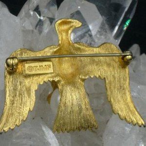 From the retired Thomas Jefferson Monticello Foundation jewelry collection, this stunning and rare vintage federal eagle brooch is crafted in textured gold plated metal. The brooch is detailed and dimensional, with individual feathers and a blue rhinestone eye. In his claws he clutches a large faux pearl. He has a tiny ding of plating loss on his left wing, other than that small blemish he is in wonderful condition. The eagle measures 1 1/2 by 1 5/8" and is signed TJMF(c).