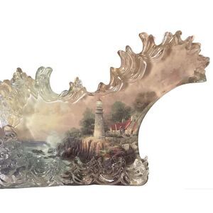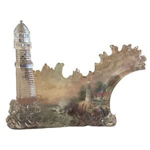 Vintage Thomas Kinkade carved resin sculpture of 2 light houses and a raging sea, “Conquering the Storm”. First, limited edition A4734. Beautiful piece for light house collectors, Thomas Kinkade lovers and small sculptures for your home. 8” X 8”X 2.5”.