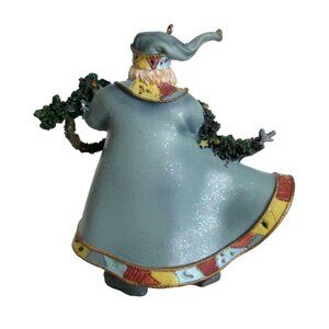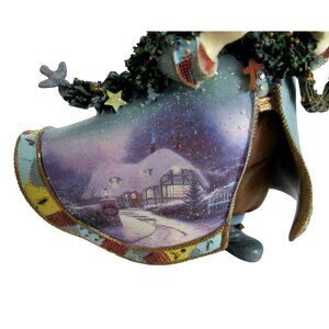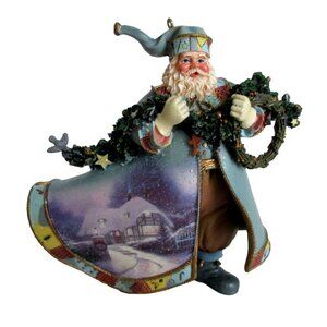 In the tranquil embrace of winter, this 2004 Thomas Kinkade Bradford Editions Santa figurine ornament captures the serenity of a snowy evening. Clad in a patchwork-trimmed coat, Santa holds a festive wreath, symbolizing warmth and holiday cheer. The detailed artistry brings a nostalgic charm, making it a cherished addition to any collection.