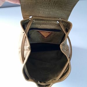 Thomas Leathers vintage croc embossed leather purse. Color is somewhere between olive green and tan. Flap and magnetic snap closure with drawstring strap. Open inner compartment, lined with suede, with one small zippered pocket. Purse is approximately 9" tall x 10.5" wide x 3" deep with a 19" strap from apex to top of bag. Great used condition. Clean and free of any major flaws. Gentle wear and very slight color variation, but nothing of note.