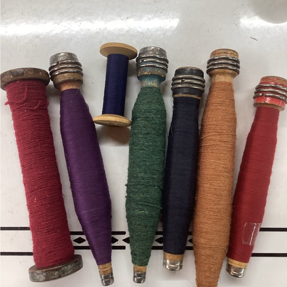 Set of vintage thread spools in various colors. Includes red, purple, green, blue, and brown threads.