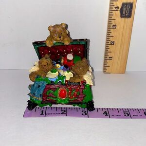 Vintage Three Angle Bears Inside Of A Red And Green Toybox W Candlestick Holder