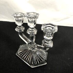Retro Three Arm Clear Glass Candleholder. Candelabra measures 7-1/4" high, base is 4" x 6", width is 7".