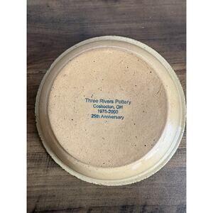 The Three Rivers Pottery 1994 Myra PUMPKIN Sponge Edge Soup Cereal Bowl is a vintage ceramic bowl featuring a round shape and a multicolor pumpkin design. Handmade in the United States in the late 20th century, this art pottery piece is a unique addition to any adult's department. With a printed backstamp and measuring 5 inches in diameter, this original production style bowl requires special care instructions of hand washing only to maintain its quality. Perfect for serving soup or cereal, this Three Rivers Pottery bowl is sure to add a touch of charm to any dining set.