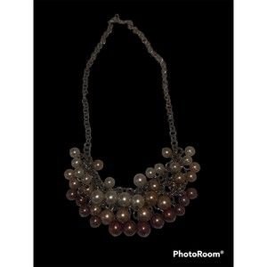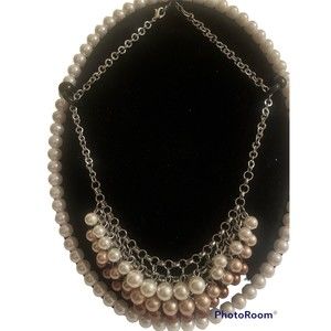 Vintage Three Strand Faux Pearl Bib Necklace. White, Pink, and Copper color faux pearls. Silver chain and links. Very good condition!