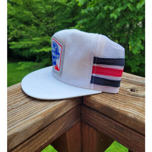This vintage Three Stripe K-Products Pabst Blue Ribbon Snapback is a great collectors piece for any PBR or old school beer fan. The foam in this hat has deteriorated but is not flaking off and gross. Hat retains a firm shape and snap works well. In good condition without stains or other damage.