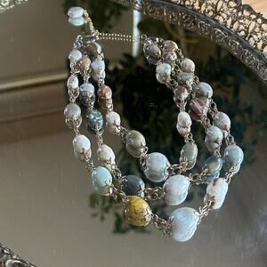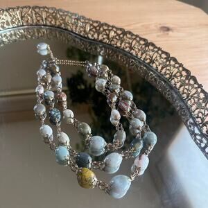 Elevated bohemian charm in this three-layer beaded necklace featuring marbled stones in calming shades of sky blue, moss green, cream, and soft amber. Each bead is individually wire-linked with antique-style silver connectors, giving a graceful drape and artisanal feel. Perfect for layering or as a statement piece with a simple dress or open neckline.