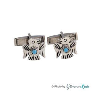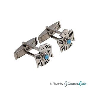 Vintage men’s jewelry set featuring Thunderbird motif cufflinks with a matching tie bar. Each piece is crafted in silver tone metal with stamped feather details and centered with a teal stone accent.