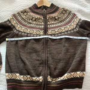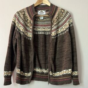 Adorable vintage zip front knit cardigan sweater with fair isle pattern across chest. Fits like a modern petite medium. Great vintage condition.