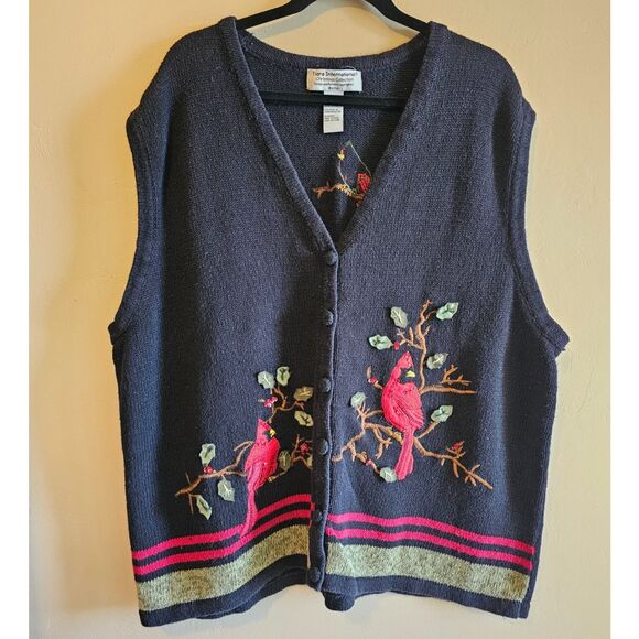 This Vintage Tiara Embroidered Red Cardinal theme Vest is a perfect addition to your Christmas collection. Made from a Ramie/cotton blend, this sleeveless vest features a button closure and intricate embroidered accents. The black color and sweater vest style make it versatile for casual occasions, while the plus size 26/28 ensures a comfortable fit for women. The vintage Tiara brand adds a touch of nostalgia to this festive piece, perfect for the winter season.