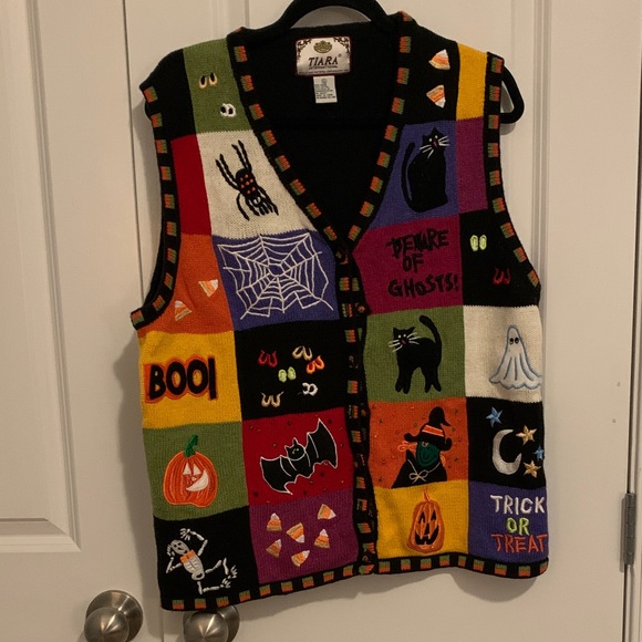 Fun Halloween vest by Tiara. Perfect for an oversized fit to wear to a Halloween party. Features colorful patchwork with festive designs. Perfect for spooky celebrations. 25 years old and in great condition. Little jewel detail on several patchwork squares as well as on each button. Ramie/Cotton blend
