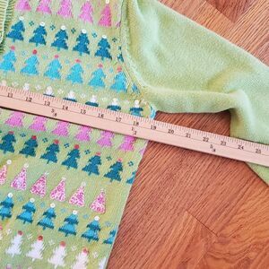 It's almost (not so) ugly sweater time! Vintage style Tiara International Christmas Collection button front cardigan sweater. Features colorful Christmas tree images topped with iridescent sequins. Also has one row of applique trees. Colors of lime green, white, bubblegum pink and turquoise blue.