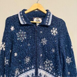 Charming navy cardigan with intricate snowflake designs. Ideal for chilly days. Vintage Tiara International holiday sweater in a rich winter blue, featuring snowflake embroidery, bead embellishments, and cozy knit texture. Festive and nostalgic, perfect for holiday parties, themed events, or just sipping cocoa in style.
