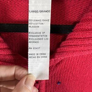 This Vintage Tiara International Christmas sweater is a must-have for any festive occasion. The relaxed fit and full zip style make it perfect for travel, parties, and casual events. The knit fabric is made of a combination of cotton and ramie, and is tight-knit for added warmth. The collar and long sleeves provide a classic look, while the red color adds a pop of holiday cheer.