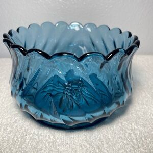 The Vintage Tiara by Indiana Glass Serving Bowl is a beautiful and decorative piece perfect for any occasion. This round bowl features a Lotus Lily pattern in a glossy blue finish, typical of the pressed glass production style. Made in North America in the late 20th century, this original production by Indiana Glass adds an elegant touch to any table setting. Hand wash only to maintain its intricate design, this vintage piece is a unique addition to any collection of decorative cookware and serveware