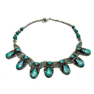 Vintage Tibetan Silver & Turquoise Statement Necklace—Multi-Teardrop Pendant EUC