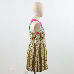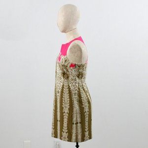Y2k vtg Tibi 6 lightweight printed cotton mini dress. Lined high neck closed halter, sleeveless tank dress. Slim relaxed fit w abstract boho paisley print.