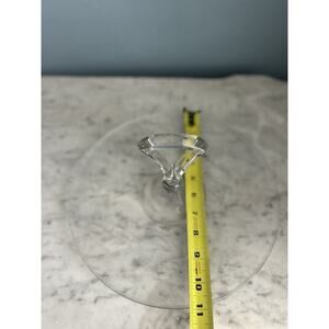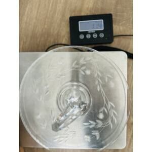 This vintage 11" serving tray features an etched glass design with floral and scallop trim details. It has handles for easy serving and is made of clear glass. Measuring 4.5" in height and 11" in diameter, this round handled server is an original piece with a retro charm.