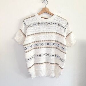 Vintage Tidewater Short Sleeve Fair Isle Cotton Knit Sweater Top in Ivory, Size Medium. Can also fit XS - Small with a more relaxed fit. See measurements.