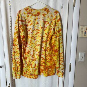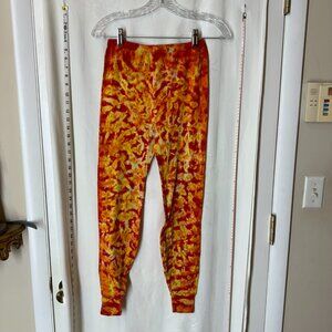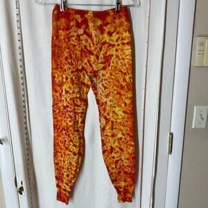 Vintage Tie-Dyed Set. OK - that's quite a color combo. If you like Cheetos or lava or grilled cheese - this may be for you. Listing as large. Top is larger. 2 small pin holes on the top and bottom. Elastic is solid. 100% cotton, made in the USA. Top: pit to pit - 22, back collar to hem - 29. Bottoms: waist - 23 with elastic at rest, inseam - 26 including bottom cuff.