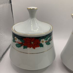 Add a touch of elegance to your holiday table with this Vintage Tienshan Deck The Halls Christmas Cream and Sugar Set. Crafted from bone china with a glossy finish, this set includes a lid, creamer, and sugar bowl adorned with a festive Christmas Poinsettia and Holly.