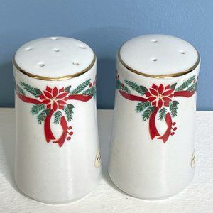 Vintage Tienshan Fairfield Fine China Poinsettia & Ribbon Salt Pepper Shaker Set