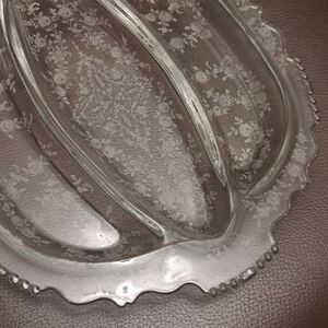 Vintage Tiffin Glass Cherokee Rose Double Handle 3 Section Divided Serving Tray etched glass.